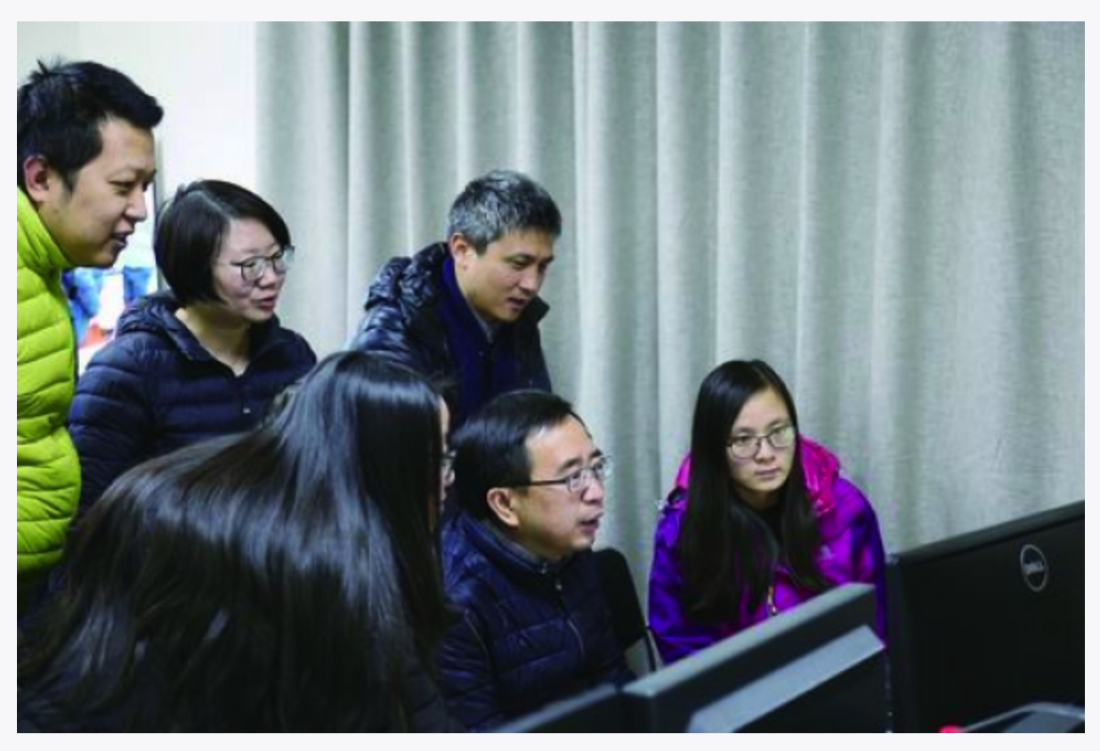 潘建伟(前排中)实验团队在讨论数据。